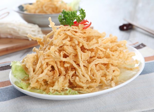 Jamur Enoki goreng dengan tekstur crispy ini menjadi makanan favorit bagi banyak orang. Karena rasa gurih dan crispy membuat semuanya orang jadi sangat menyukainya. Kalian bisa mencobanya sendiri dirumah untuk dijadikan cemilan untuk keluarga. Agar teksturnya lebih garing, bisa memasukkan jamur yang dibalur telur dan tepung ke dalam freezer. Cukup dimasukkan selama 5-10 menit sebelum digoreng.