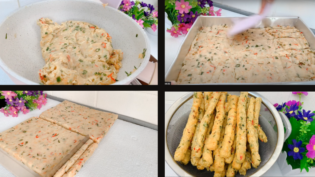 - Adonan yang berbentuk kotak kemudian dibagi menjadi dua bagian. Lalu tiap bagian dipotong-potong memanjang dan goreng pada minyak sayur yang telah panas