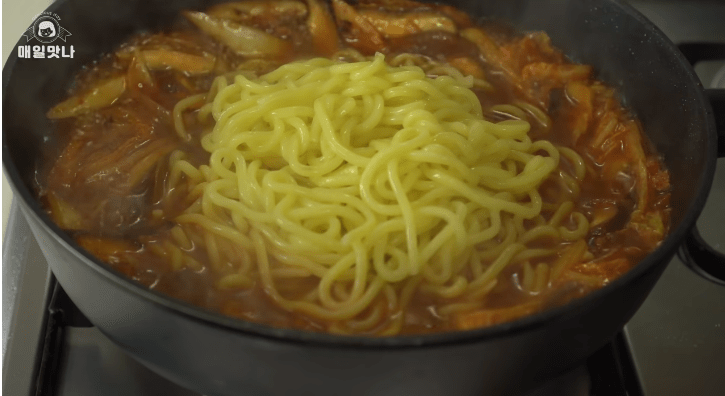 - Saat kuah sudah mendidih, masukkan mie dan air campuran tepung kanji.