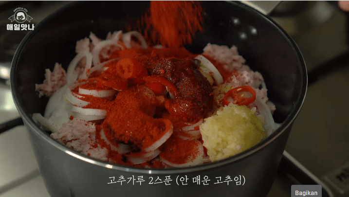 - Masukkan 1 sdm pasta cabai merah, 1/3 sdm pasta kacang kedelai, 3 sdm kecap dan 2 sdm cabai merah bubuk (tidak pedas)