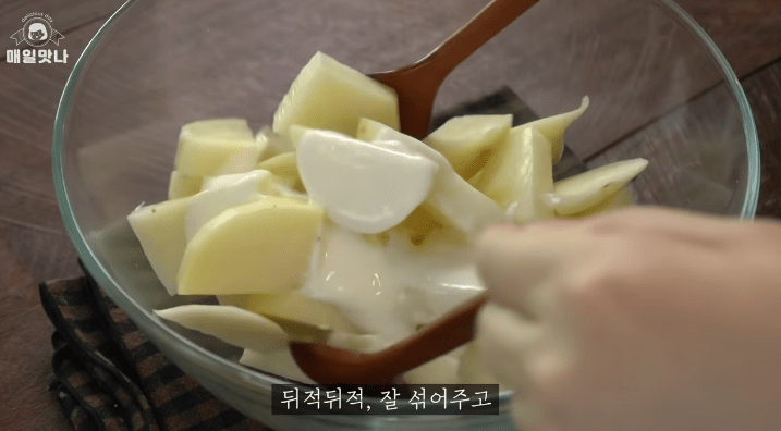 - Tambahkan bumbu untuk mengasinkan kentang, aduk rata lalu tutup dan simpan dalam lemari pendingin selama setengah jam