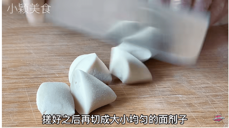 - Tiap bagian yang dipotong lalu digulung-gulung hingga membentuk bulat dan Panjang. Setelah itu potong kembali menjadi bagian-bagian kecil untuk dibuat kulit pangsit.