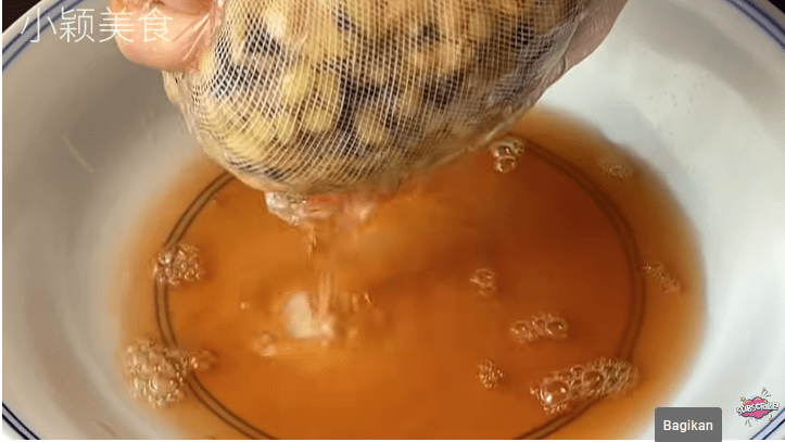 - Jika sudah 10 menit, bungkus terong dengan kain lalu peras airnya. Simpan terong yang telah diperas dan air perasannya pada wadah berbeda.
