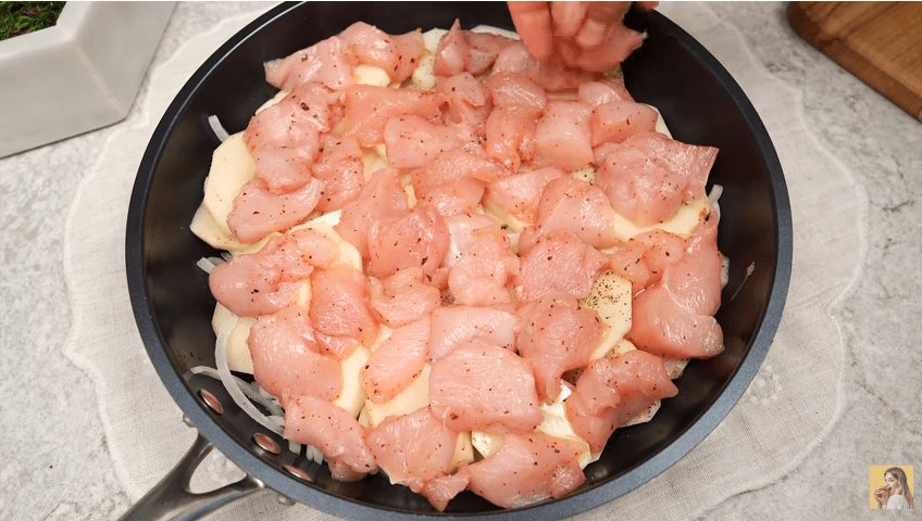 - Pindahkan ayam yang telah dibumbui ke atas kentang di wadah anti panas.