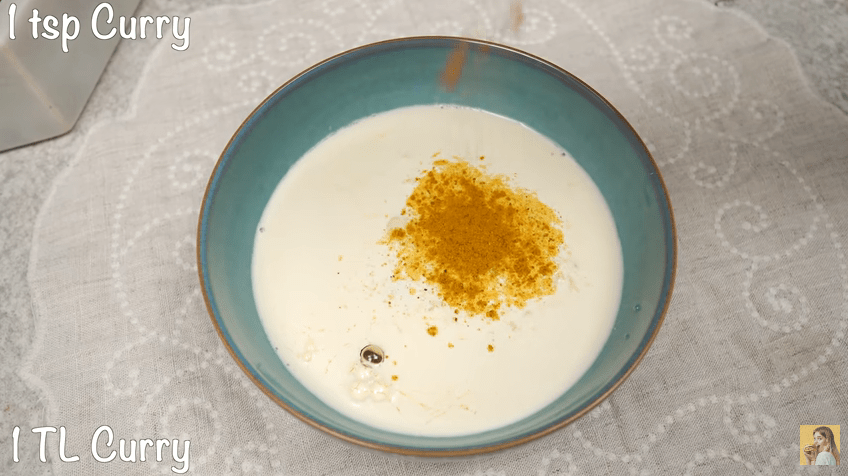 - Siapkan mangkuk, pecahkan 2 butir telur ke dalamnya. lalu tambahkan 200ml krim kental. Sebelum diaduk, beri sejumput garam dan 1 sdt bubuk kari. Lalu kocok semua bahan hingga tercampur.