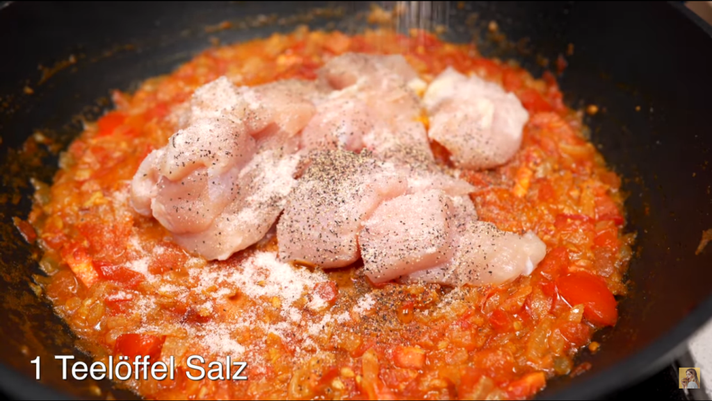 - Masukkan potongan dada ayam ke dalam wajan yang berisi tumis bawang dan lainnya. Beri garam dan lada bubuk. Lalu aduk rata