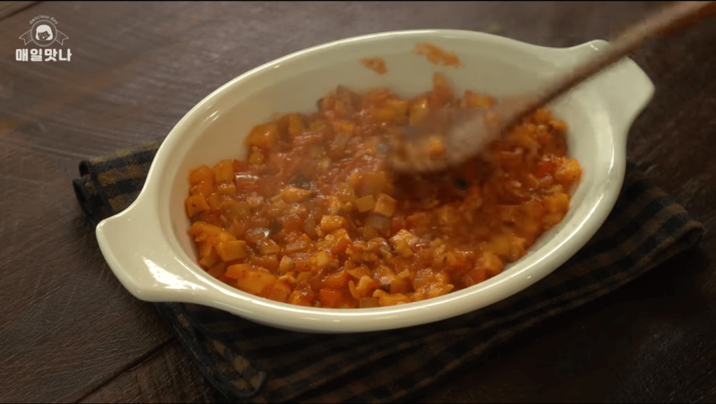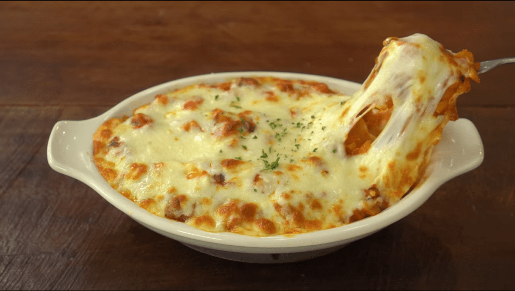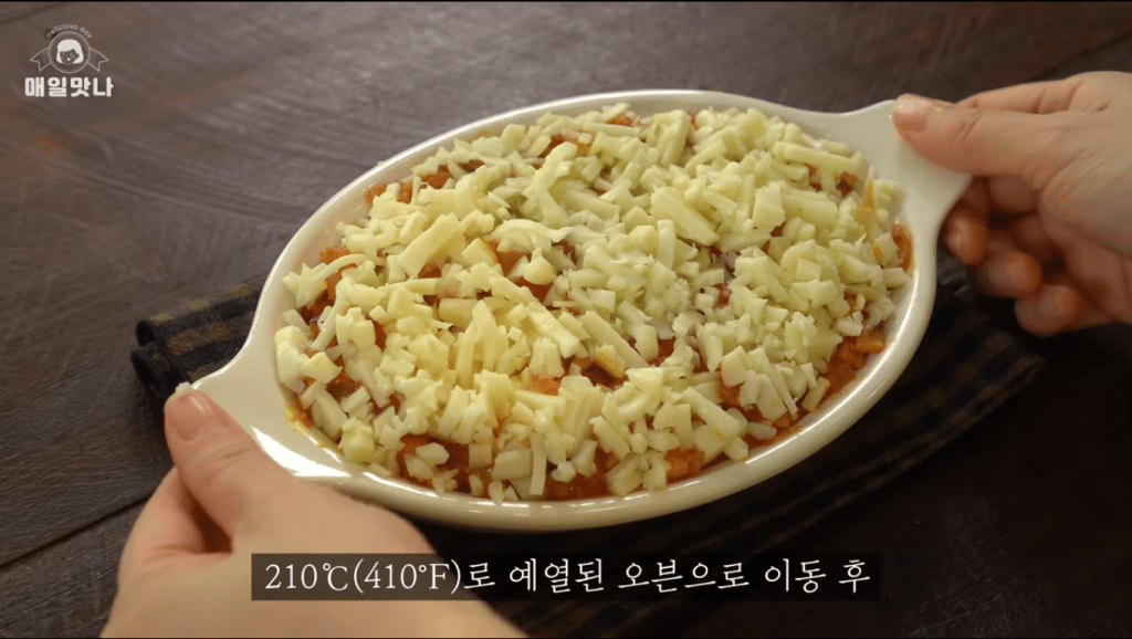 Pada bagian kedua kita menambahkan potongan keju mozarela di bagian paling atas. Kemudian panaskan dalam oven dengan suhu 210 derajat celcius selama 10-15 menit. Tunggu hingga keju mozzarella menyatu dan semua bahan menjadi hangat dan saling menyatu rasanya.